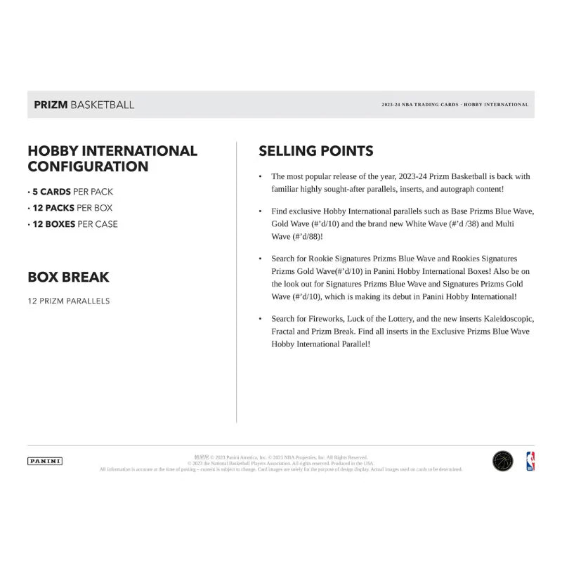 The 2023/24 Panini Prizm Basketball International Hobby Box is the ultimate treasure for basketball card enthusiasts. Renowned for its vibrant and glossy designs, this edition highlights the top NBA players, emerging rookies, and iconic legends. The 2023/24 Panini Prizm Basketball International Hobby Box is a must-have for those looking to capture the essence of the NBA in a spectacular way.