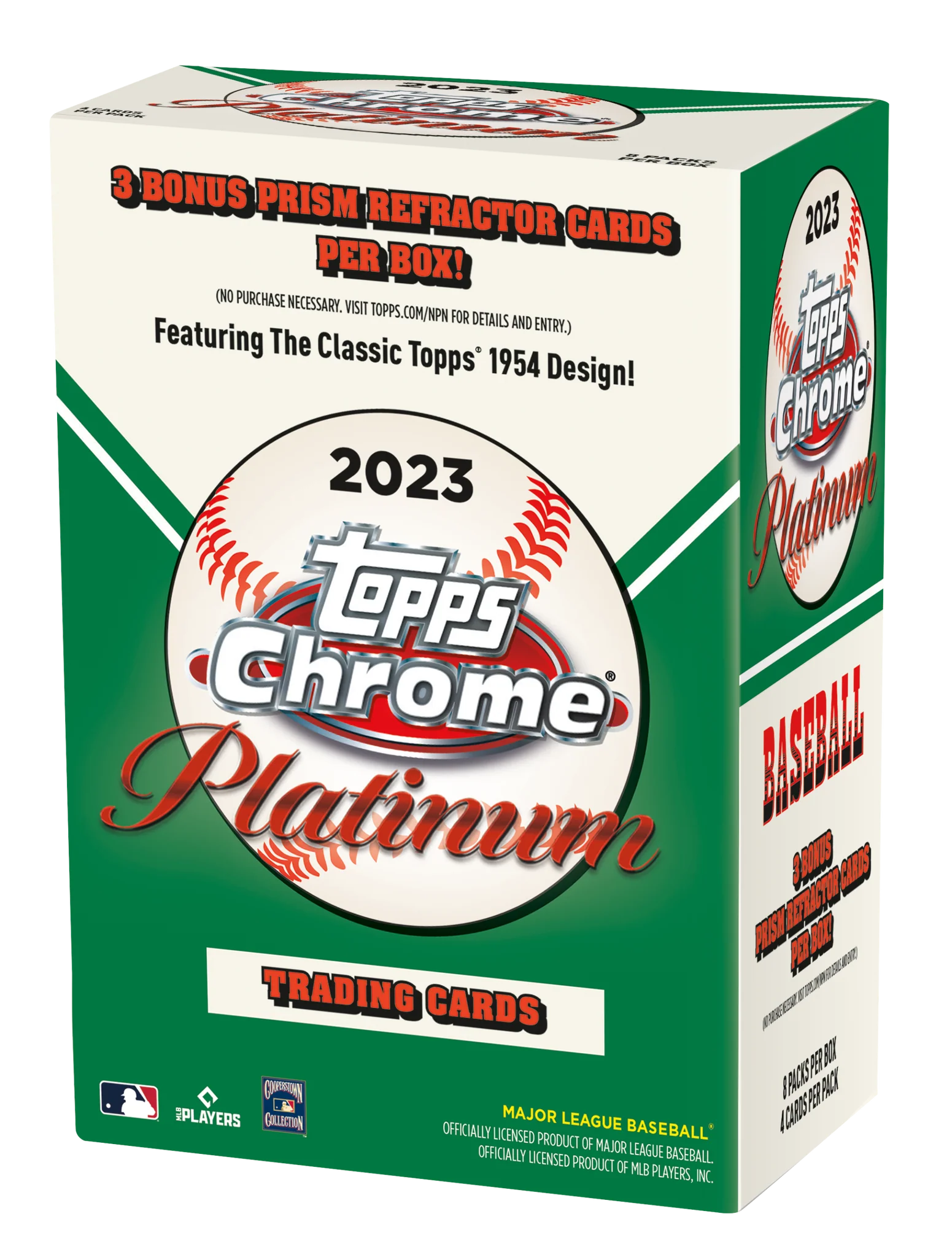Jumping into another absolute classic in the Topps vault, 2023 Topps Chrome Platinum celebrates the iconic 1954 Topps design! Collect the entire 500-card Base Set across a variety of color and pattern chrome parallels! Find three Exclusive Prism Refractor Parallels per Value Box!