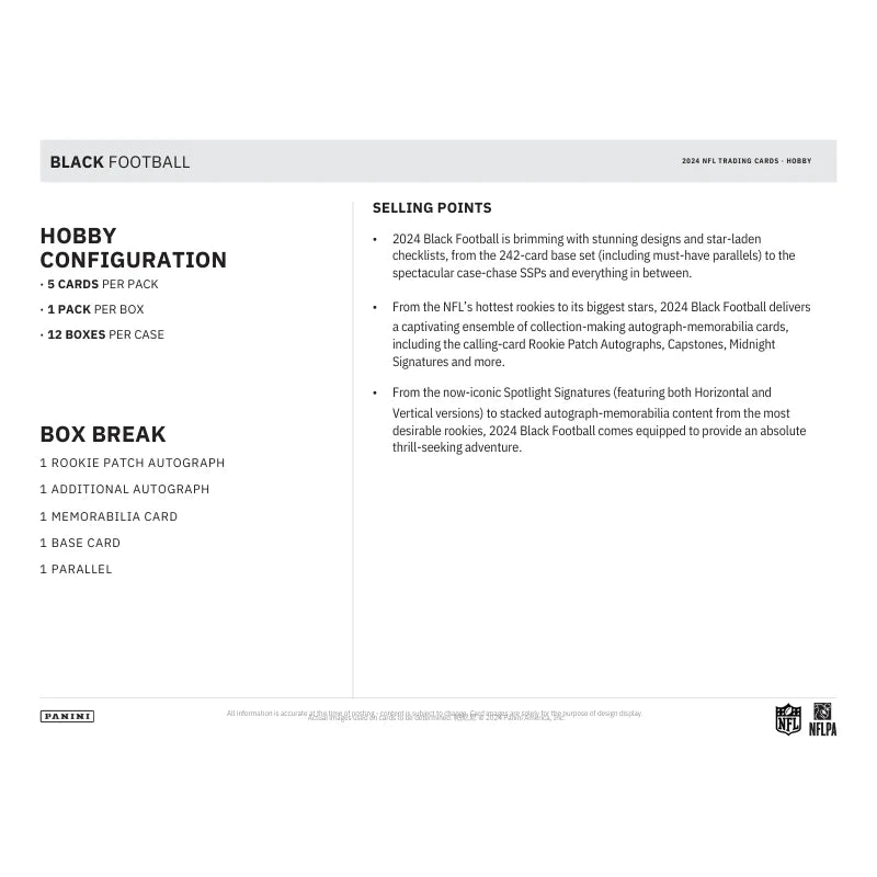 - 2024 Black Football is brimming with stunning designs and star-laden checklists, from the 242-card base set (including must-have parallels) to the spectacular case-chase SSPs and everything in between.