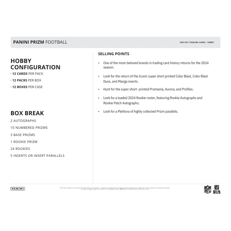 The 2024 Panini Prizm Football Hobby Box delivers the vibrant and collectible Prizm technology that fans know and love, spotlighting the NFL's brightest stars, rookies, and legends. Each box contains 12 packs, featuring a mix of stunning parallels, inserts, and autographs, including exclusive short-printed Prizms like Gold, Black Finite (1/1), and others. With on-card Rookie Patch Autographs, rare case-hit inserts, and a lineup of both veterans and first-year players, this product is a must-have for football enthusiasts and collectors chasing standout hits.