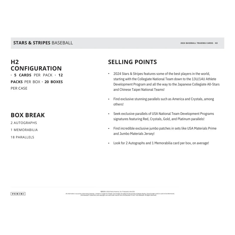 Step into the world of elite baseball talent with the 2024 Panini Stars and Stripes Baseball H2 Hybrid Box! This collection features some of the best players globally, from the Collegiate National Team to the 13U/14U Athlete Development Program, and includes stars from the Japanese Collegiate All-Stars and Chinese Taipei National Teams. Don’t miss the chance to add these remarkable cards to your collection with the 2024 Panini Stars and Stripes Baseball H2 Hybrid Box!