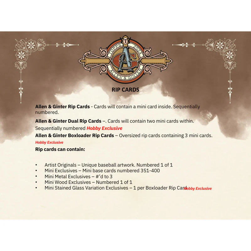 Each Hobby Box of 2024 Topps Allen & Ginter delivers 3 hits, including On-Card Autographs, Relics, Original A&G Buybacks, Book Cards, Cut Signatures, and Rip Cards!