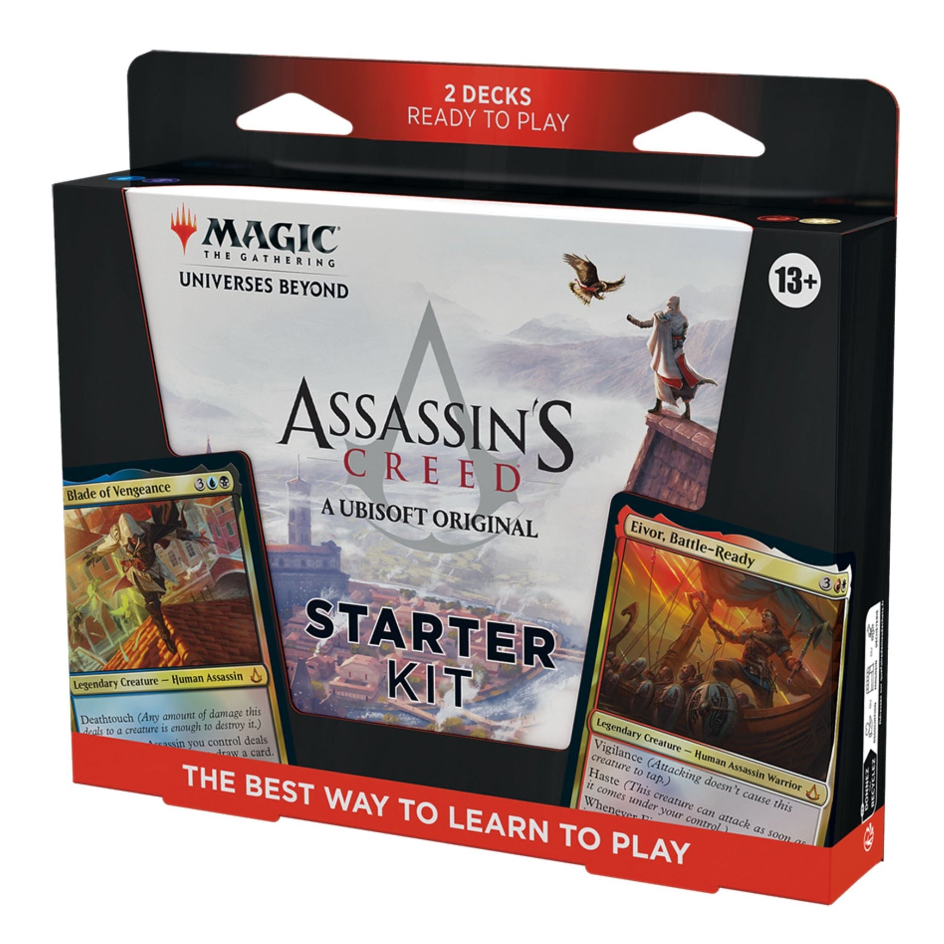 Each Assassin's Creed Starter Kit contains: - [2] ready-to-play 60-card decks: 1 red-white deck and 1 blue-black deck - [2] Mythic Rare cards (1 per deck) - [8] Rare cards (4 per deck) - [2] deck boxes (1 per deck) - [1] Magic the Gathering play guide